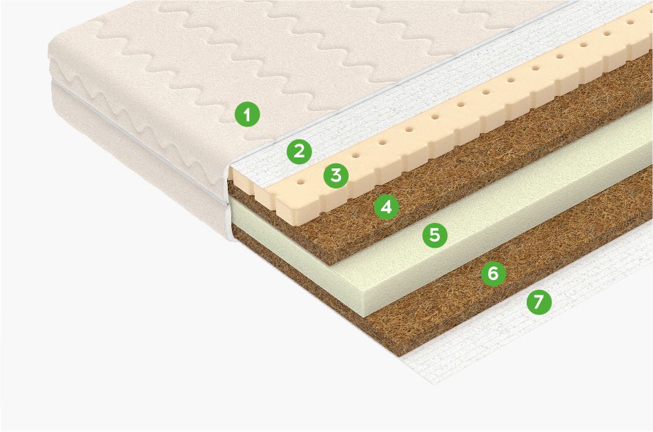 Кокосовая койра - натуральный материал, состоящий из спрессованных волокон кокосового ореха. Слои из прочной и долговечной кокосовой койры используются для придания матрасу дополнительной жесткости - 7