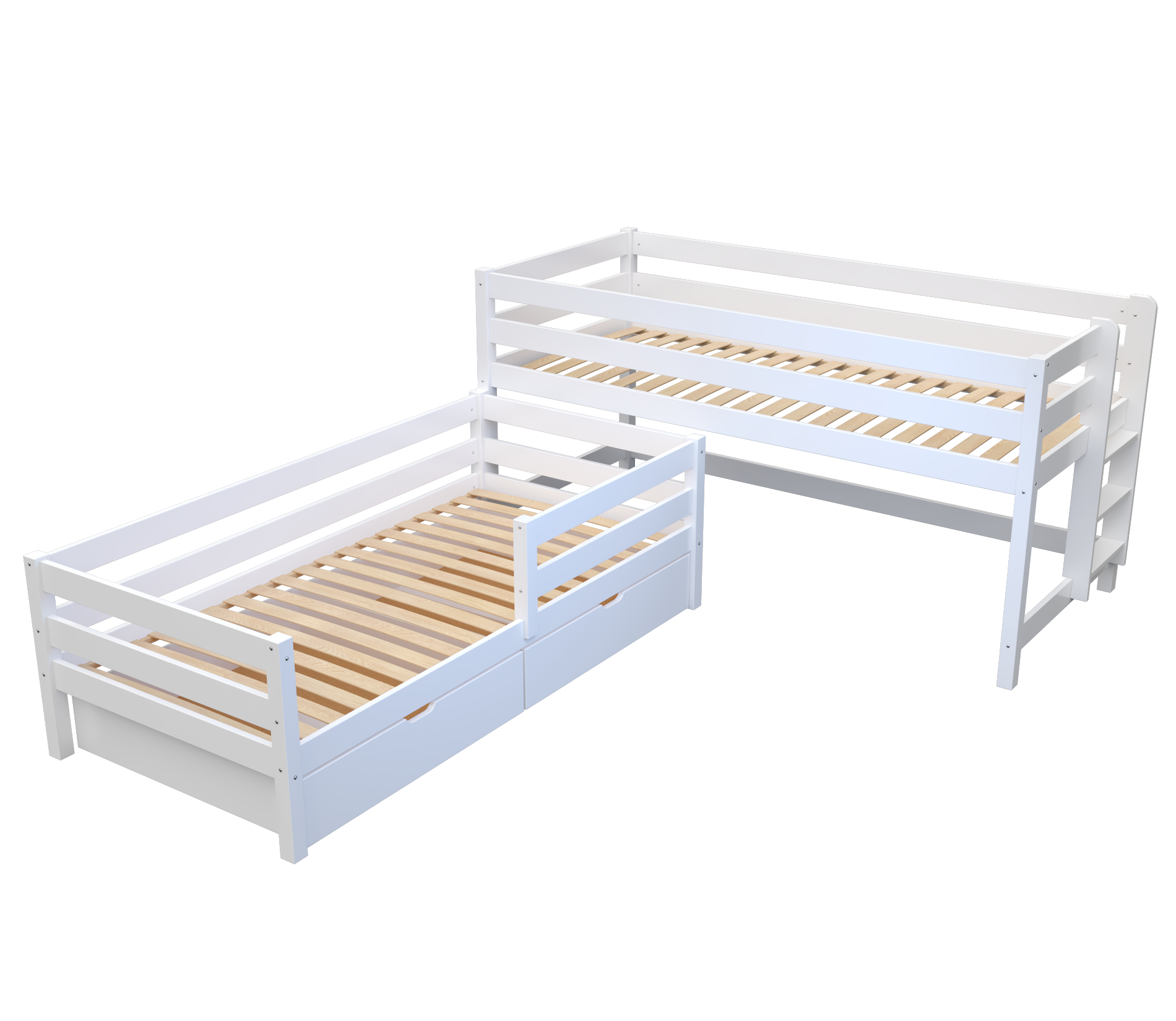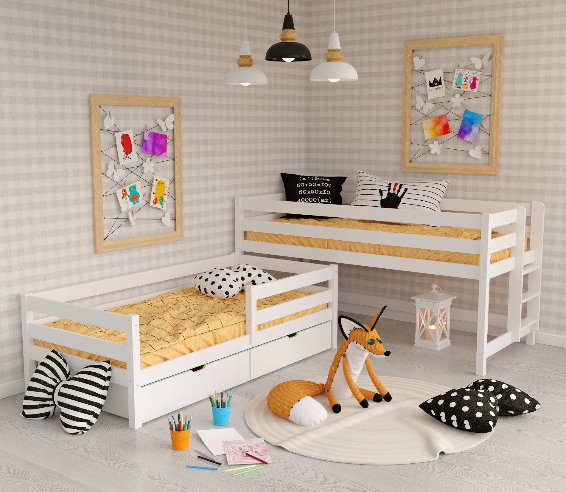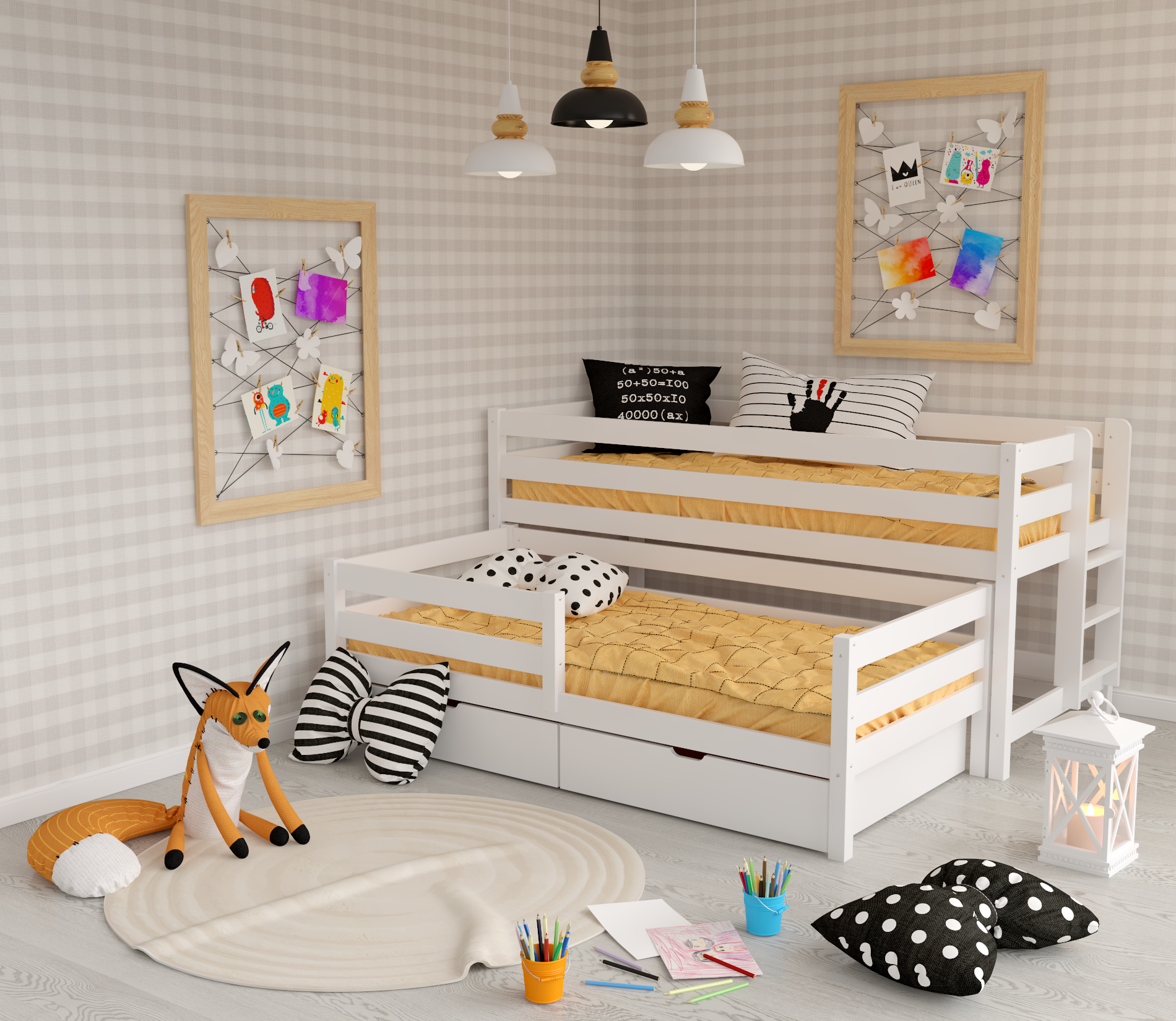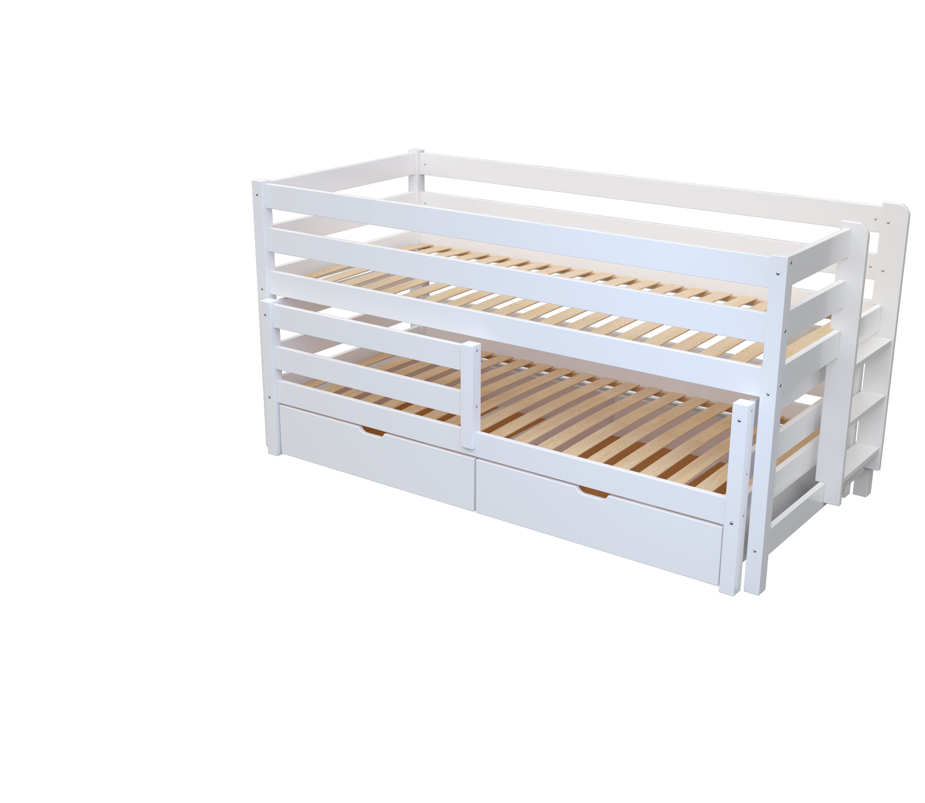 • высота бортов второго этажа 37 см от настила до края стенки. Борт устанавливается с любой стороны. Лестница устанавливается на правую либо левую сторону. Кровать можно использовать как двухъярусную, либо как две полноценные отдельностоящие кровати ( к заказу доступны по отдельности). Односпальная кровать Мелита может доукомплектовываться дополнительным спальным местом или выдвижными ящиками.
