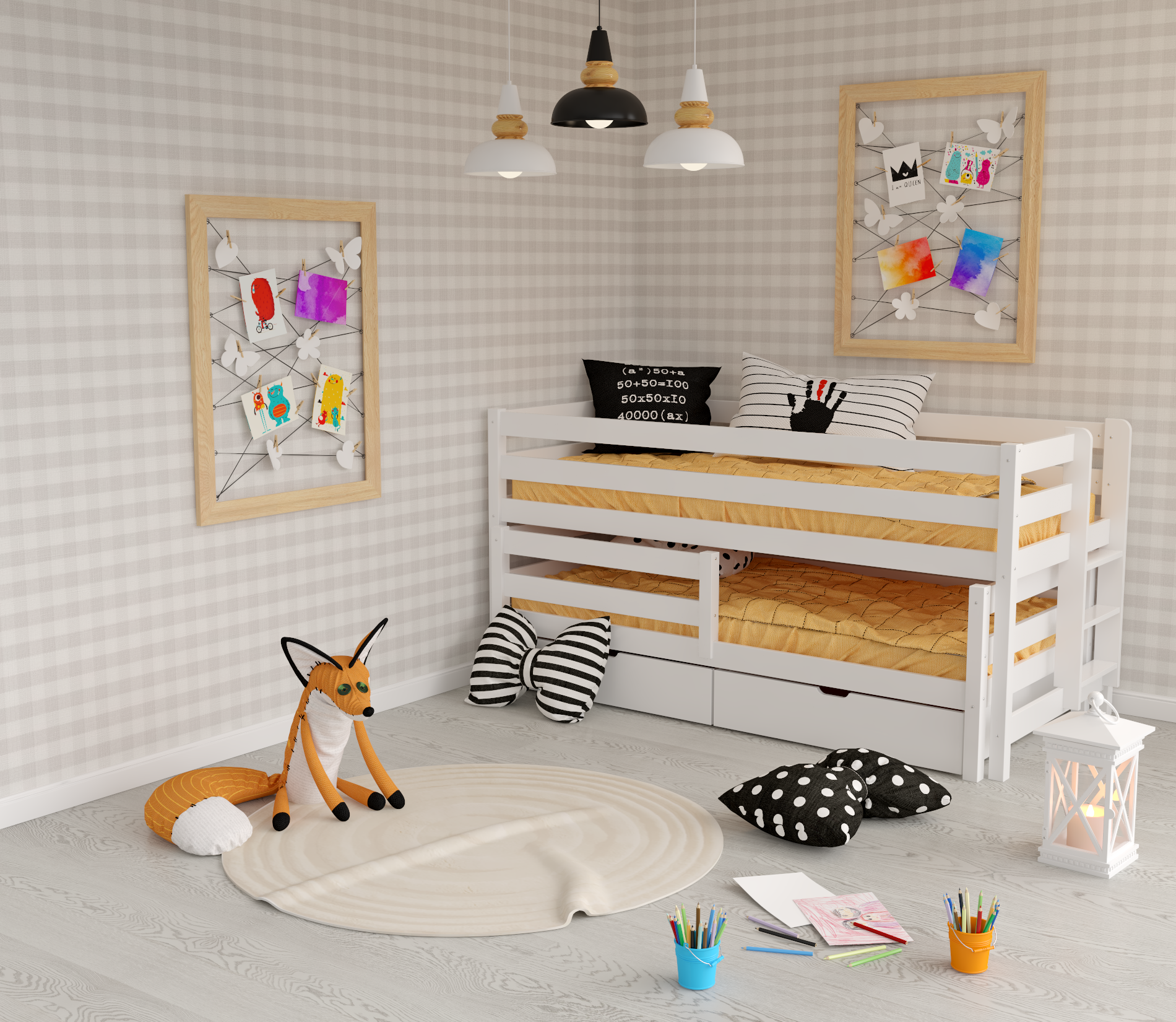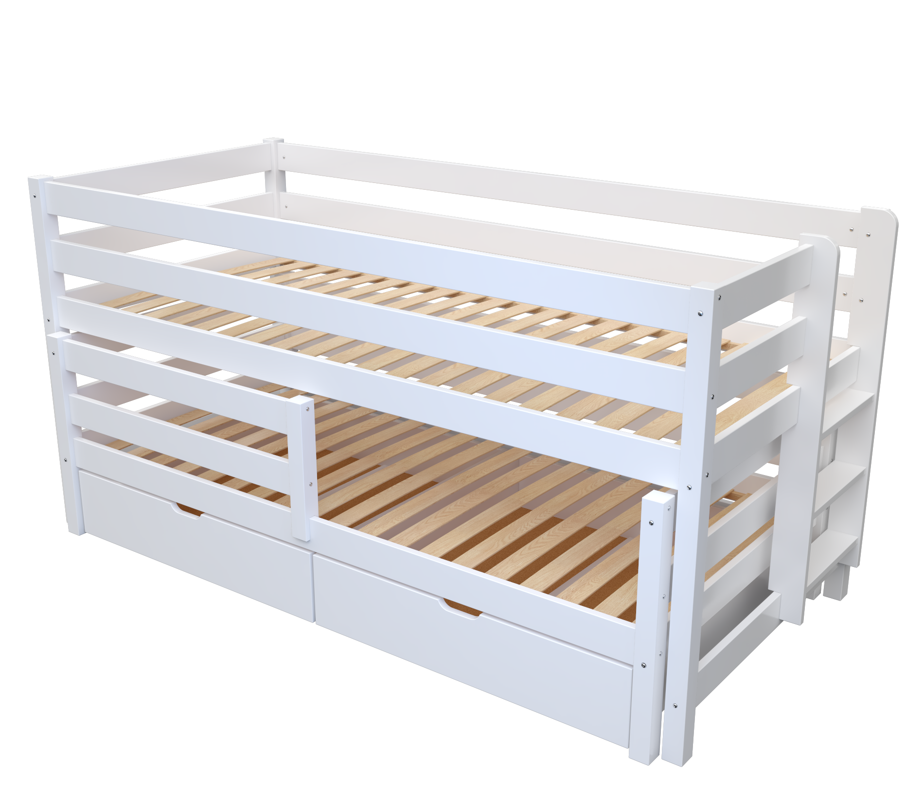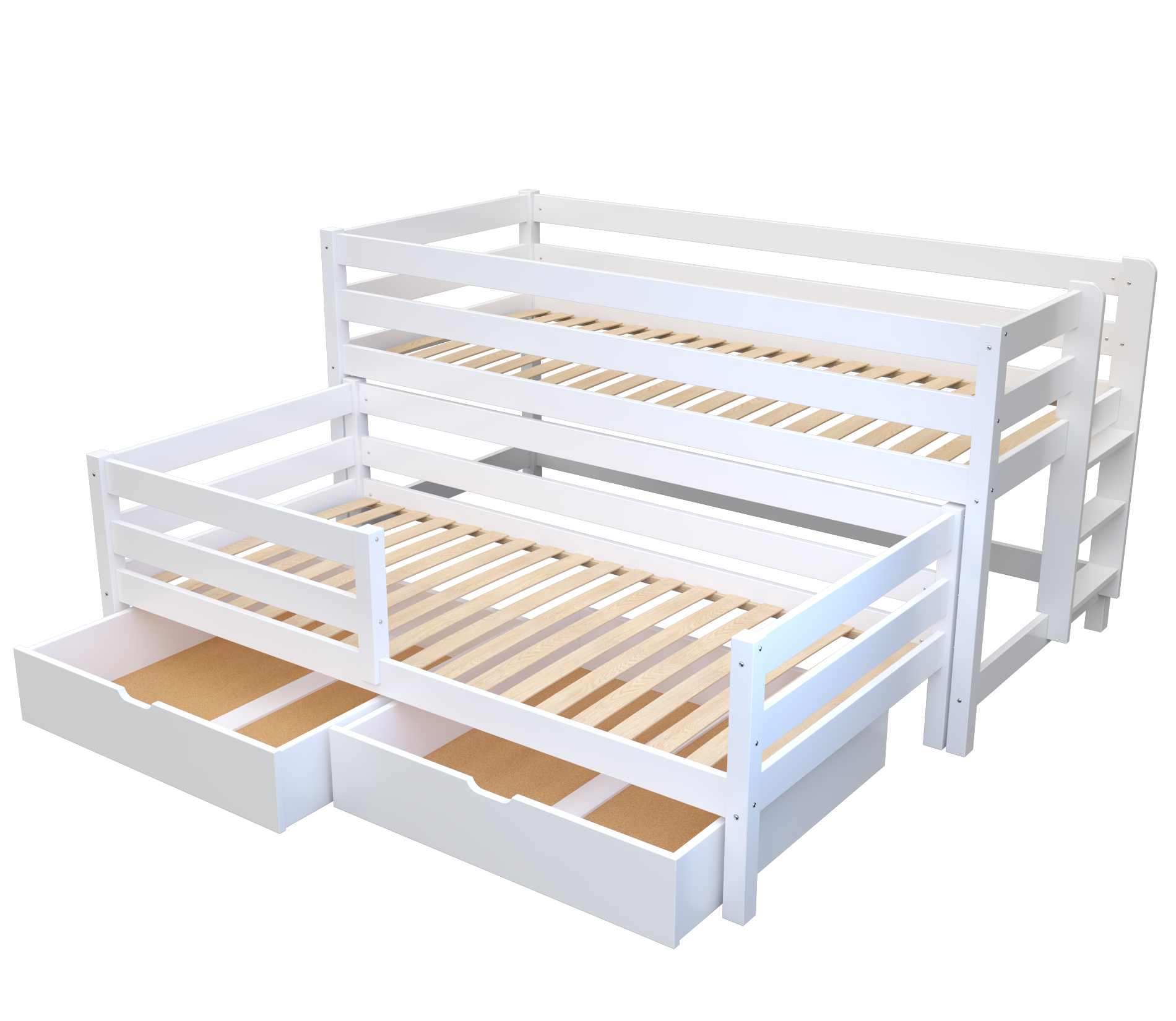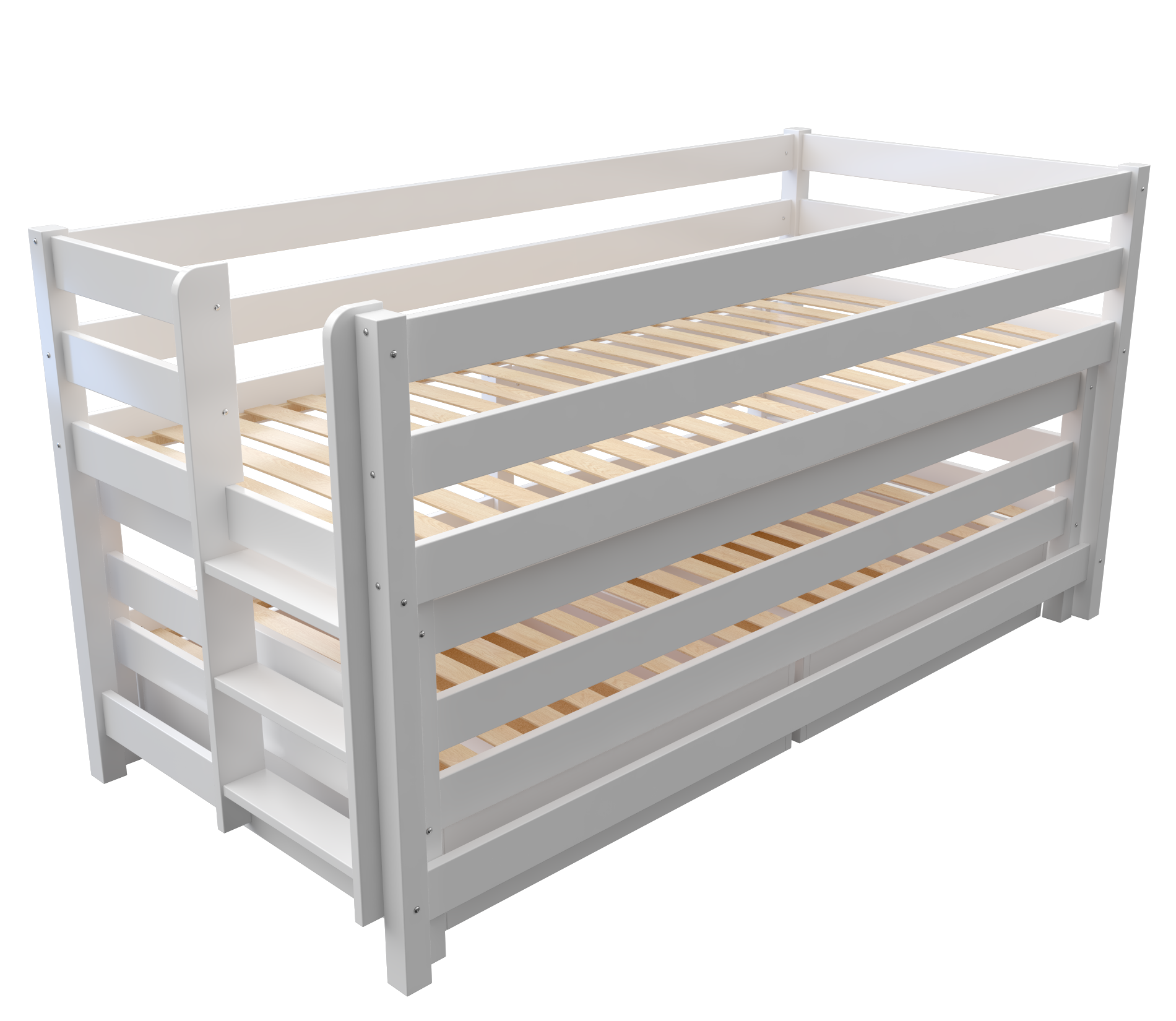 • высота бортов второго этажа 37 см от настила до края стенки. Борт устанавливается с любой стороны. Лестница устанавливается на правую либо левую сторону. Кровать можно использовать как двухъярусную, либо как две полноценные отдельностоящие кровати ( к заказу доступны по отдельности). Односпальная кровать Мелита может доукомплектовываться дополнительным спальным местом или выдвижными ящиками.
