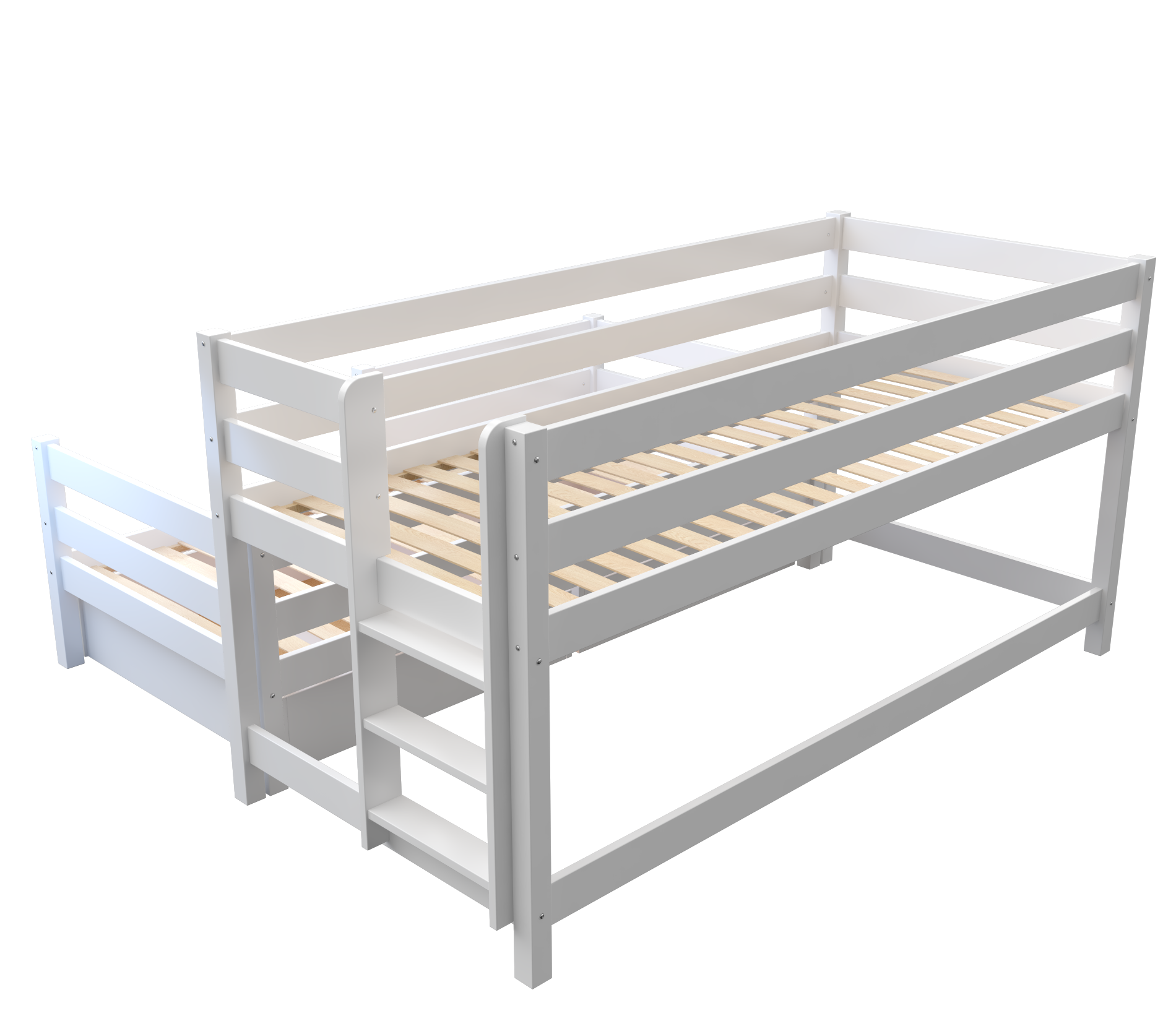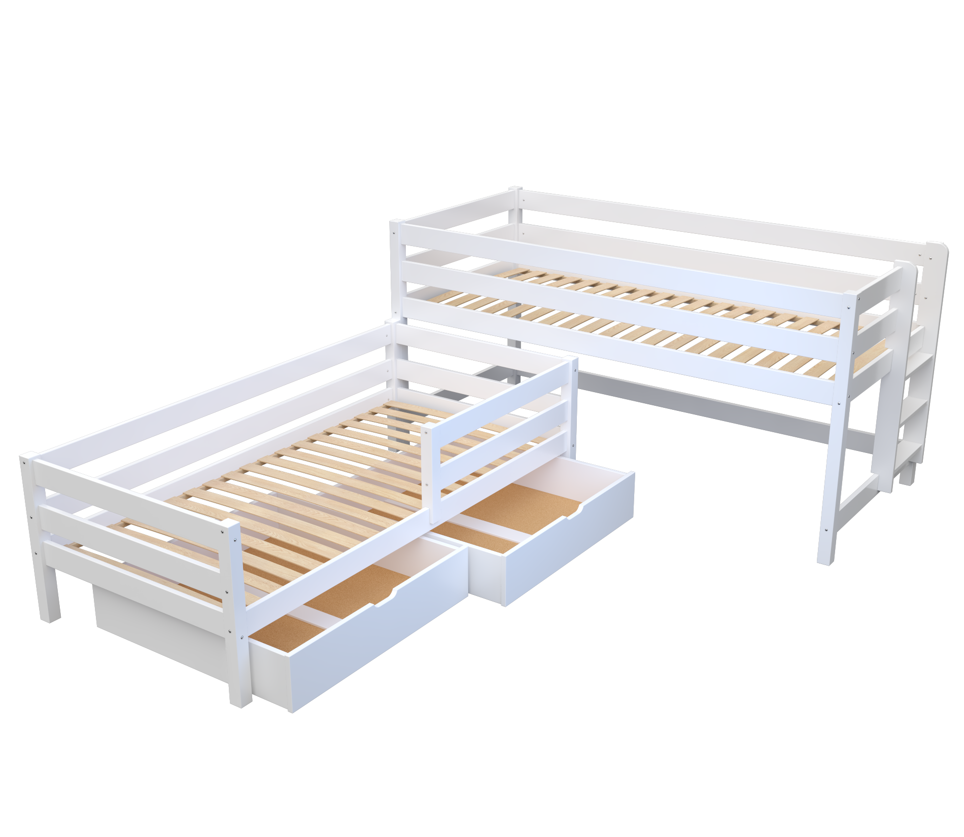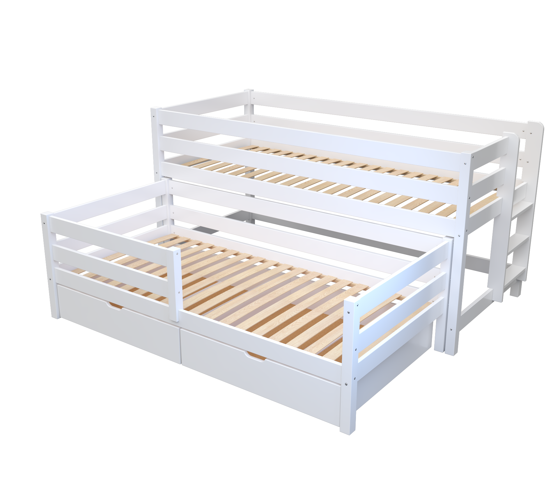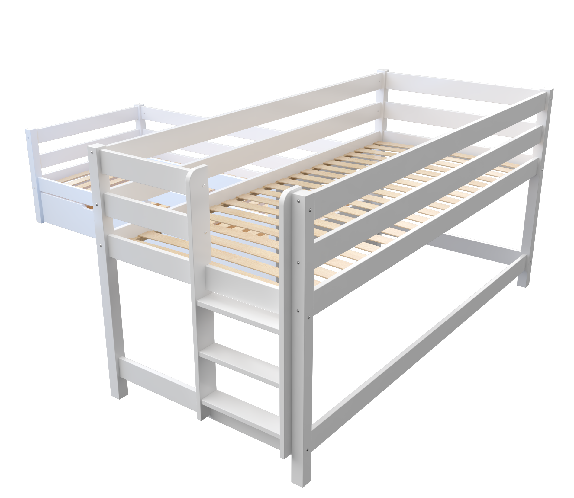• высота бортов второго этажа 37 см от настила до края стенки. Борт устанавливается с любой стороны. Лестница устанавливается на правую либо левую сторону. Кровать можно использовать как двухъярусную, либо как две полноценные отдельностоящие кровати ( к заказу доступны по отдельности). Односпальная кровать Мелита может доукомплектовываться дополнительным спальным местом или выдвижными ящиками.
