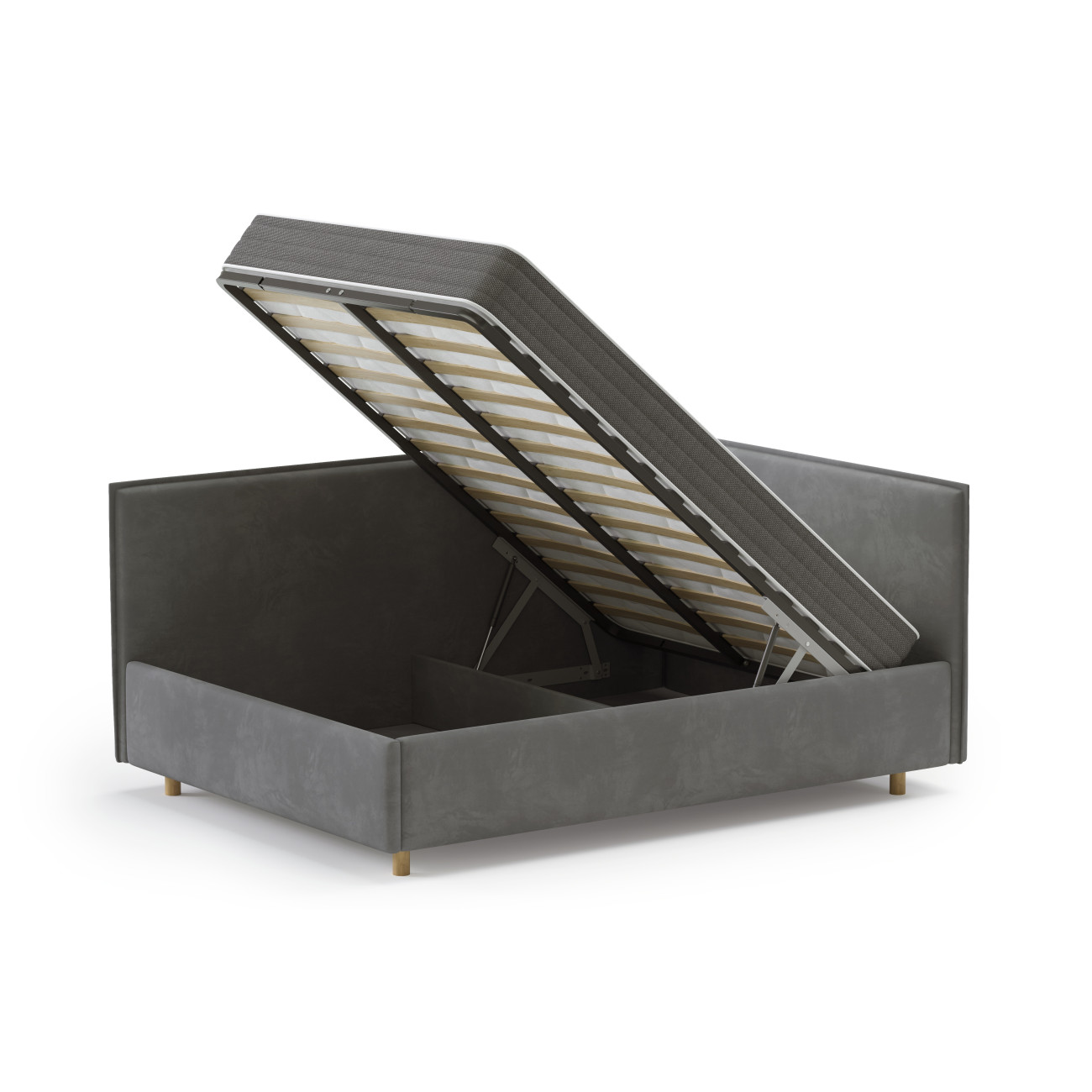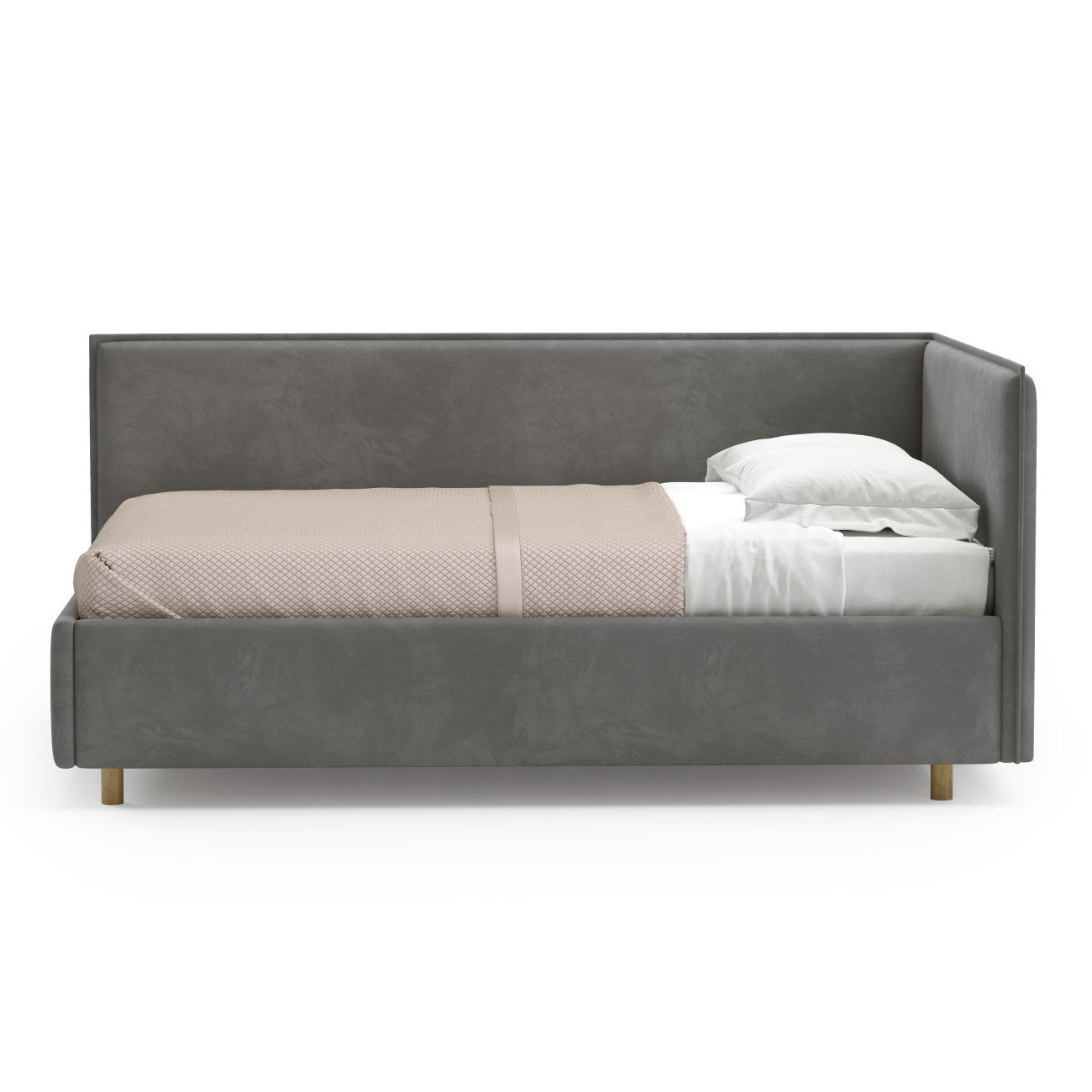 • Мягкая кровать-кушетка на деревянных ножках. Есть опция установки подъемного механизма с нишей для хранения. Каркас из ДСП/сосновый брус.